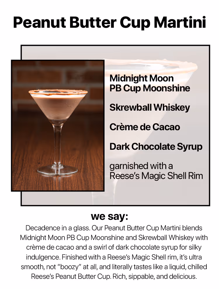 And at the bar, like the placekicker who’s automatic from any distance, chalk up a walk-off win with the silky smooth motion of the PEANUT BUTTER CUP MARTINI. With Midnight Moon PB Cup Moonshine, Skrewball Whiskey, crème de cacao, and dark chocolate syrup, it’s like drinking a chilled liquid Reese’s. An extra point you can’t miss.
